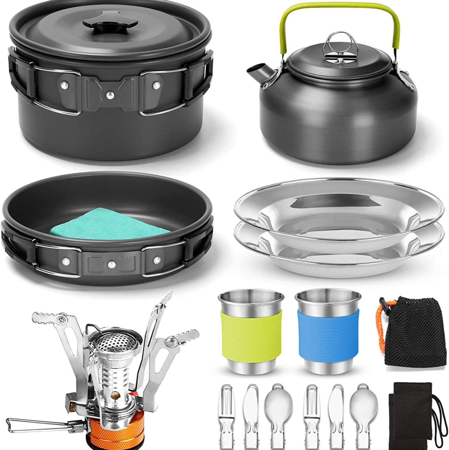 16pcs Camping Cookware Set with Folding Camping Stove, Non-Stick Lightweight Pot Pan Kettle Set with Stainless Steel Cups Plates Forks Knives Spoons for Camping Backpacking Outdoor Picnic