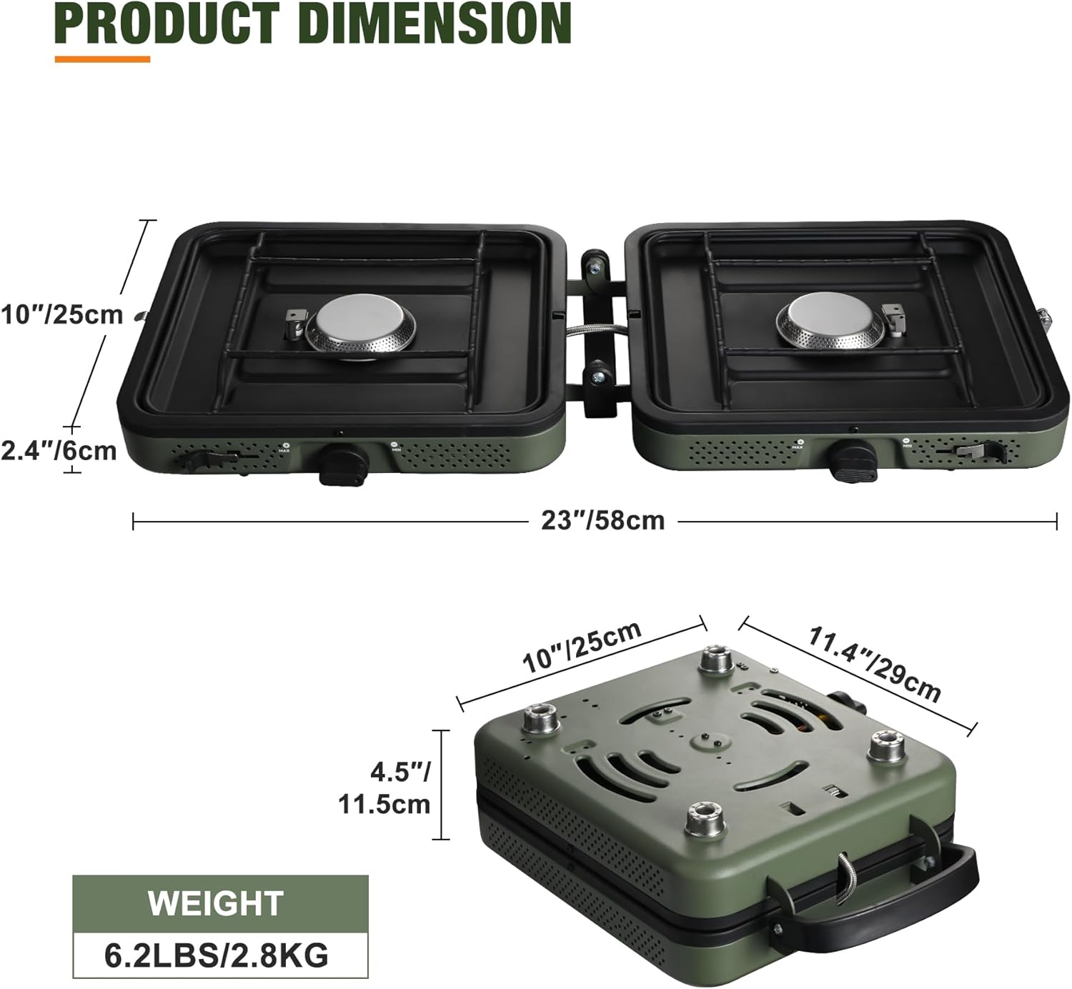• Dual Burner Design: Our Camping Stove features a dual burner setup, allowing you to cook 2 pans or pots with a diameter of up to 10” simultaneously, maximizing efficiency and saving you valuable time on outdoor adventures