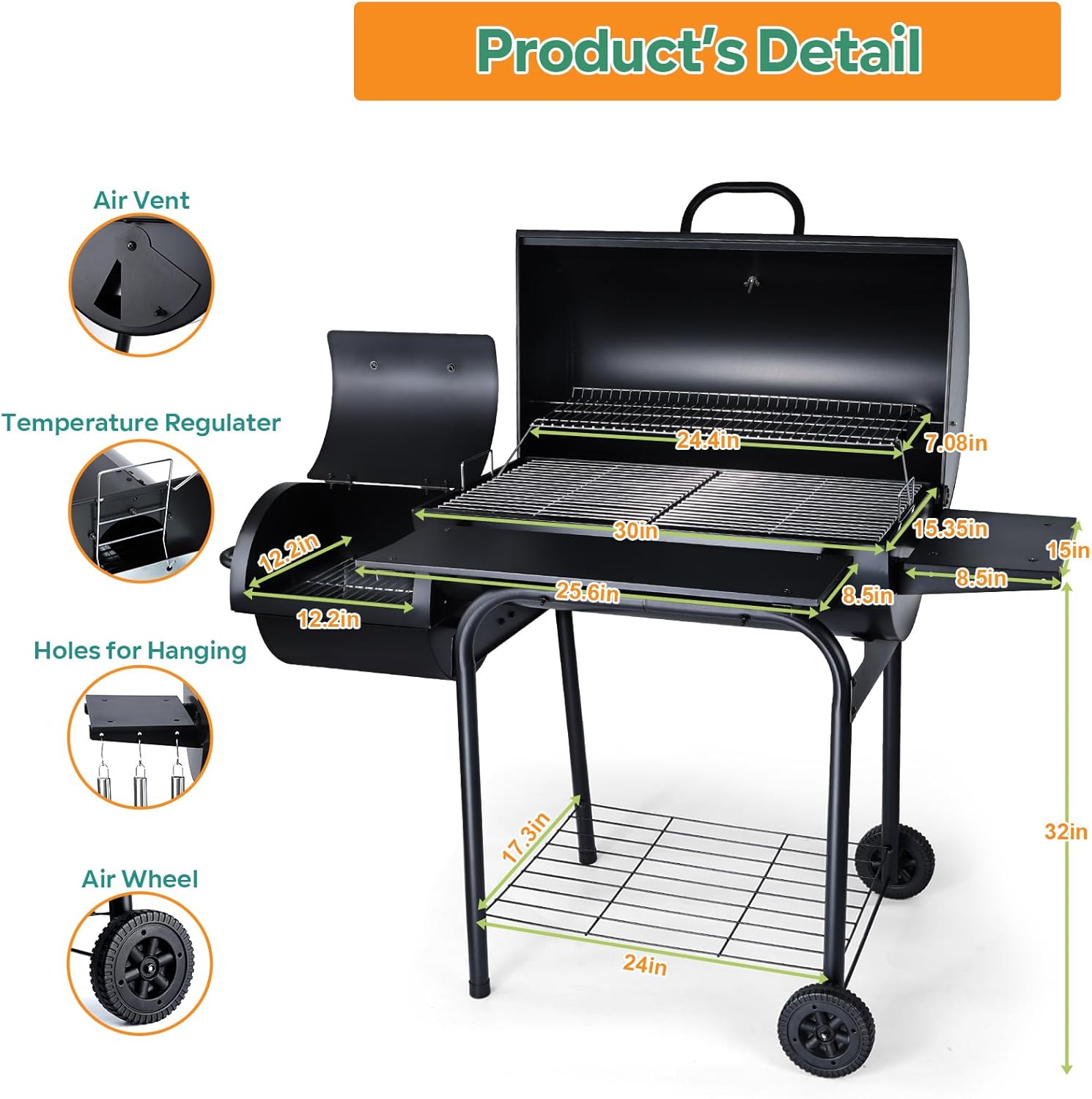 • [Firebox & Ventilation] – The smoke chamber firmly attached to the main body, smoke can through the hole into the large barrel grill to create a smoke-filled environment, Smoke flavour enthusiast can add different wood chips in the firebox chamber to smoke meat, Chimney and side air vent can be adjusted to control airflow and release smoke effectively